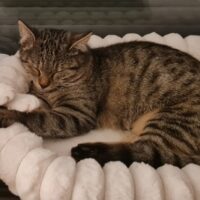 Sie ist grau- bräunlich getigert, weiblich, 1 Jahr, kastriert und leider nicht gechipt.