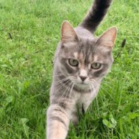 Besondere Merkmale: Kleine graue Katze mit grünen Augen, sterilisiert und gechippt